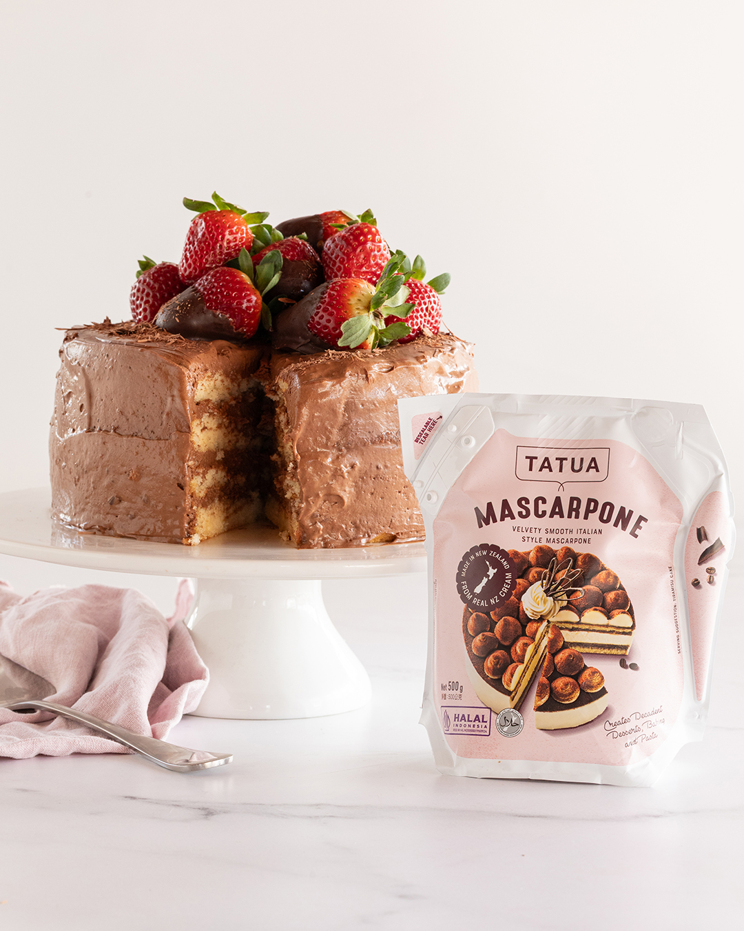 Layers of fresh sponge with chocolate mascarpone mousse make for are show stopping cake, perfect of a celebration or special dessert.